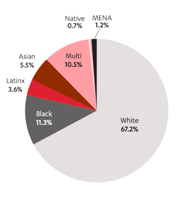 White share of all theatrical film roles increased from 59.6 percent in 2023 to 67.2 percent in 2024, reversing the steady trend measured in preceding years. While MENA (1.2 percent) actors were at proportionate representation, all other groups, including Black (11.3 percent), Latinx" (3.6 percent), Asian" (5.5 percent), multiracial (10.5 percent), and Native (0.7 percent) actors, were underrepresented among all theatrical film roles in top films in 2024.