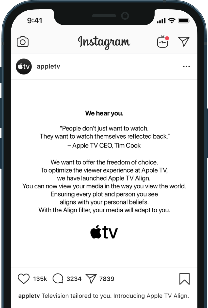 A provocative (and slightly controversial) social media stunt where Apple TV announces a feature that could filter content that doesn’t align with people’s views.